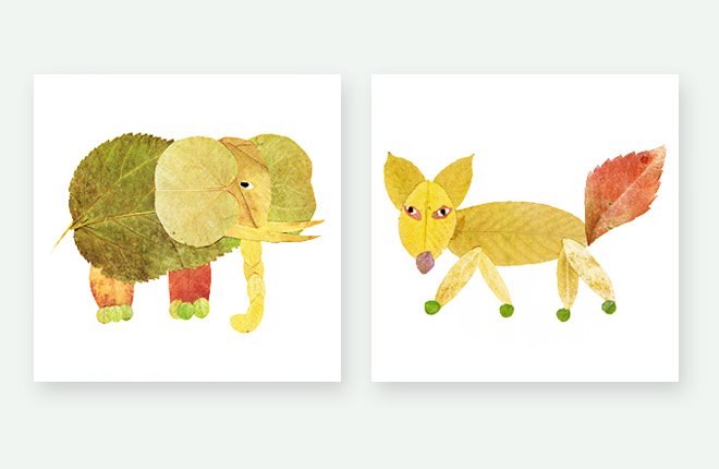 Собрать картинки, используя листики как конструктор. Будет удобней, если листья предварительно слегка высушить под прессом (в энциклопедии, например).